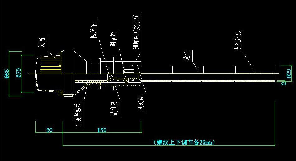 可調式長柄濾頭由濾帽、濾桿、預埋座三部分組成。通過旋轉濾桿的上下調整,使安裝在濾板上的所有濾頭進氣孔保持在同一水平高度。可調式濾頭的預埋座緊固在整體澆筑模板上的結構形式,在不改變濾池工藝和結構前提下,可便捷地上下調整濾桿的螺紋上口的水平高度,達到布氣配水均勻的效果。
